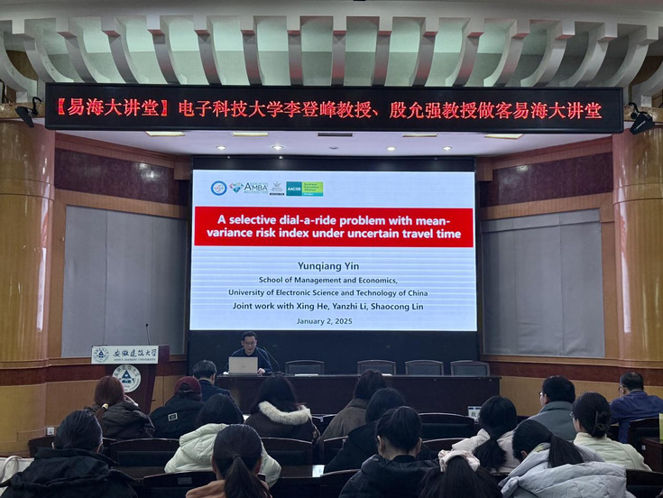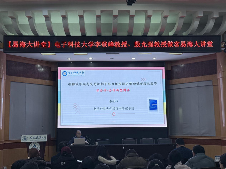 本网讯 1月6日,电子科技大学李登峰教授、殷允强教授做客beat365官方网站第128期易海大讲堂,为学校师生带来了题为“碳排放限额与交易机制下电力供应链定价和低碳技术投资非合作-合作两型博弈”和“A Selective Dial-a-ride Problem With Mean-variance Risk Index Under Uncertain Travel Time”(不确定旅行时间下具有均值方差风险指标的选择性拨号乘车问题)的精彩报告。南京信息工程大学管理工程学院博士生导师、beat365官方网站经济与管理学院学术院长屈绍建教授出席本期易海大讲堂。报告会由经管学院院长彭志胜教授主持,经济与管理学院领导班子、部分骨干教师、研究生和本科生共计80余人参加了报告会。