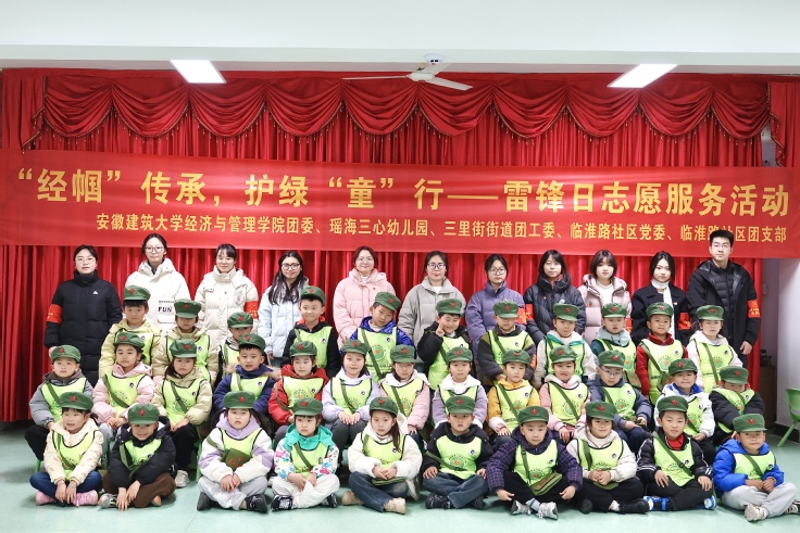 本网讯 3月4日,在第62个 "学雷锋纪念日" 来临之际,受三里街街道团工委、临淮路社区党委、临淮路社区团支部邀请,经济与管理学院 "菁琯" 青年志愿者服务队15名队员走进合肥瑶海三心幼儿园,通过 "故事讲述+仪式教育+劳动实践" 三位一体模式,为30余名学龄前儿童带来沉浸式雷锋精神教育体验。