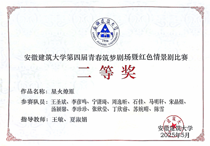 在beat365官方网站第四届青春筑梦剧场暨红色情景剧比赛中,作品《星火燎原》荣获二等奖,学院荣获最佳组织奖。让革命先辈的理想信念与家国情怀在舞台上穿越时空,与当代青年进行了一场心灵的对话,使革命文化从抽象概念转化为可体验、可感知的精神洗礼,在学院范围内营造了浓厚的红色文化氛围,激发了青年学子的爱国情怀和使命担当。