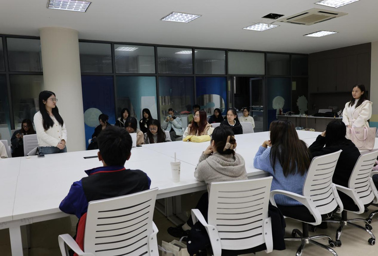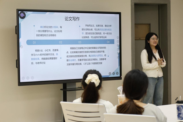 本网讯 为促进知识共享,帮助同学们了解科研前沿,进一步激发大家对科学研究的热情,近日,经管学院在金寨路校区建树楼525举办主题为“四季悦读,秋华文会”学术沙龙活动,活动邀请经管学院23级硕士研究生孙乐越,24级硕士研究生王娟进行学术交流分享。本次活动由经管学院团委研究生会承办,30余名研究生参与活动。