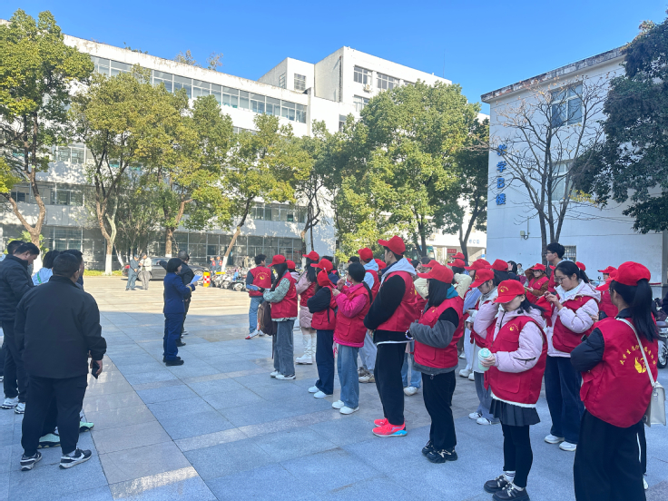 活动启幕,阳光洒在整齐列队于校图书馆门口的志愿者身上。他们身着统一服装,身姿挺拔、眼神坚定,合影定格下炽热的公益初心。身着制服的消防救援支队人员专程护送,悉心叮嘱入户宣传注意事项,为活动筑牢安全防线,也传递了责任与担当的精神力量。