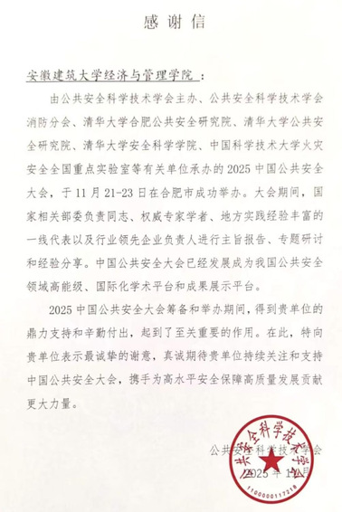 鉴于志愿者团队的卓越贡献,主办方公共安全科学技术学会特向经管学院发来感谢信。此次活动的成功参与,不仅有力支持了国家级重要会议的顺利举办,也是经管学院践行“立德树人”根本任务、注重培养学生社会实践能力与志愿服务精神的重要体现。经管学子用行动诠释了“奉献、友爱、互助、进步”的志愿精神,在服务国家与社会发展的实践中书写了绚丽的青春篇章。(作者:吴雨彤、高沛;一审:孙文;二审:汪令宇;三审:潘和平)