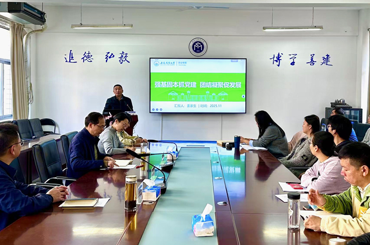 11月26日下午,经管学院于建树楼404会议室举办2025年度党建工作骨干培训班总结大会。会上,学院党委组织员高德龙以《规范组织生活,筑牢坚强堡垒》为题讲授专题党课,党课从“三会一课”、主题党日、组织生活会等组织生活基本制度入手,详细讲解了规范流程、关键环节和注意事项,强调要以严标准、实举措抓好组织生活,不断增强党支部的凝聚力和战斗力。