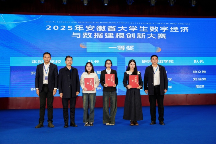 本网讯 近日,由安徽大学经济学院、新华学院财会与金融学院、蚌埠学院经济与管理学院承办的2025安徽省大学生数字经济与数据建模创新大赛在蚌埠圆满落下帷幕。beat365官网学子与来自安徽大学、安徽农业大学、安庆师范大学、阜阳师范大学等众多队伍同台竞技,最终周琪、卢旭东、王毅分别组建的团队分获研究生组一、二、三等奖各1项,汪晓君组建的团队获本科生组二等奖1项。