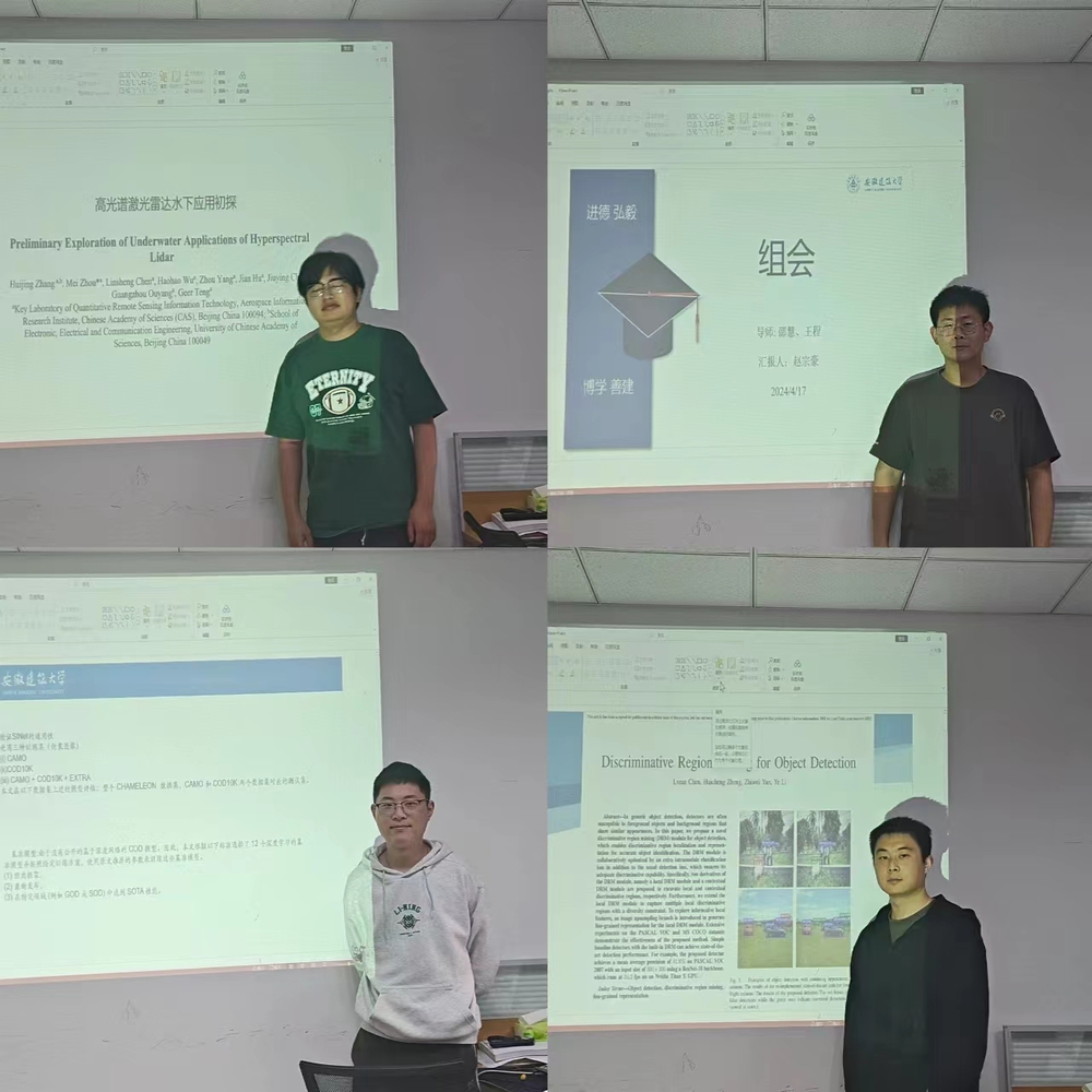 4月17日中午,研究中心在实验综合楼608举办小型研讨会。来自研二的四名同学分别汇报各自领域的研究内容。李幸运同学和张胡龙同学汇报了关于高光谱激光雷达方面的具体应用,赵宗豪同学和王旭同学分别汇报了关于图像分割领域和药物-靶标相互作用的预测方向的最新研究成果。