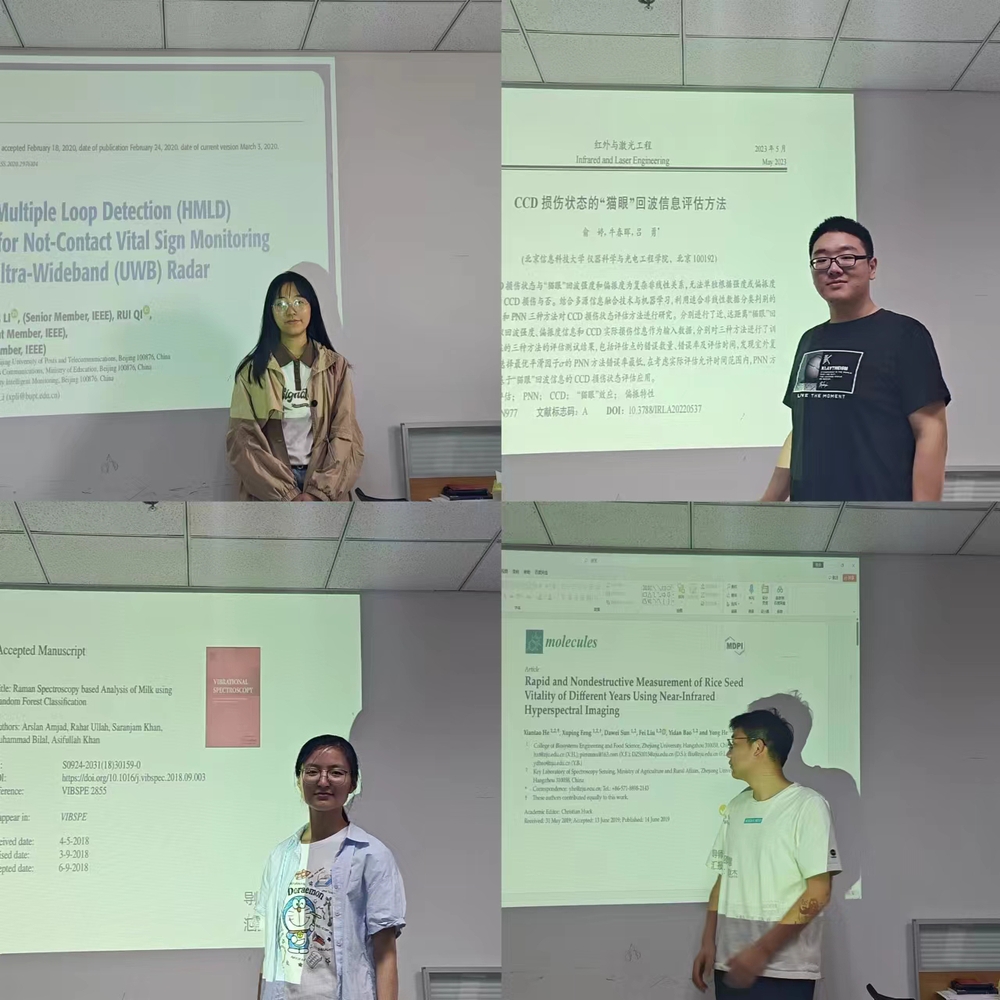 5月15日中午,研究中心在实验综合楼608举办小型研讨会。来自研一的四名同学分别汇报各自领域的研究内容。赵杰同学和朱吉雨同学分别汇报了高光谱激光雷达领域最新研究成果,胡蝶同学和薛芙蓉同学分别汇报了关于毫米波雷达和随机森林算法的具体应用。