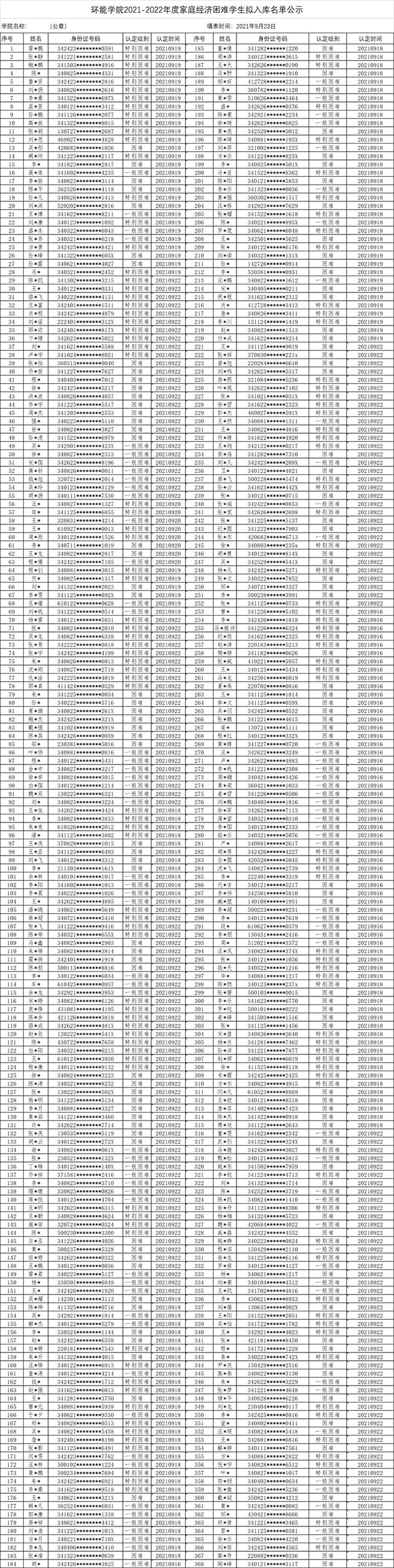 根据校学函[2021]93号《关于做好2021年度家庭经济困难学生认定工作的通知》要求,对环境与能源工程学院拟入库的雷*鹏等368名学生进行公示。公示时间为5个工作日(2021年9月24日-9月29日)。