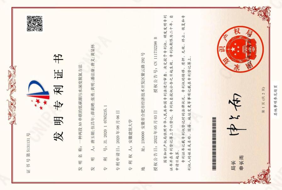 5 | 一种两段AO串联的低碳源污水深度脱氮方法 | ZL 2020 1 0785235.1 |