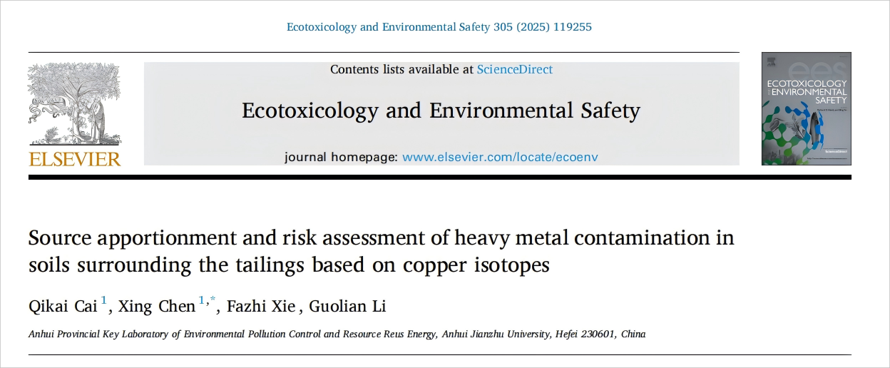 近日,环境与能源工程学院陈星老师在该研究领域取得新进展,在环境毒理学与安全领域知名期刊《Ecotoxicology and Environmental Safety》(中科院1区,影响因子6.1)在线发表了题为“Source apportionment and risk assessment of heavy metal contamination in soils surrounding the tailings based on copper isotopes”的科研论文。陈星老师为共同第一作者兼通讯作者,beat365官方网站为第一完成单位。