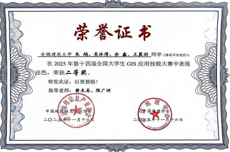 本网讯 近日,第十四届全国大学生GIS应用技能大赛在西安科技大学成功举办。环能学院黄木易、陈广洲教授指导的2022级和2023级地理信息科学专业本科生朱越、吴冰倩、余鑫和王晨羽组成的代表队参加了比赛,荣获全国二等奖。