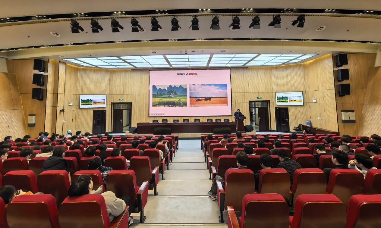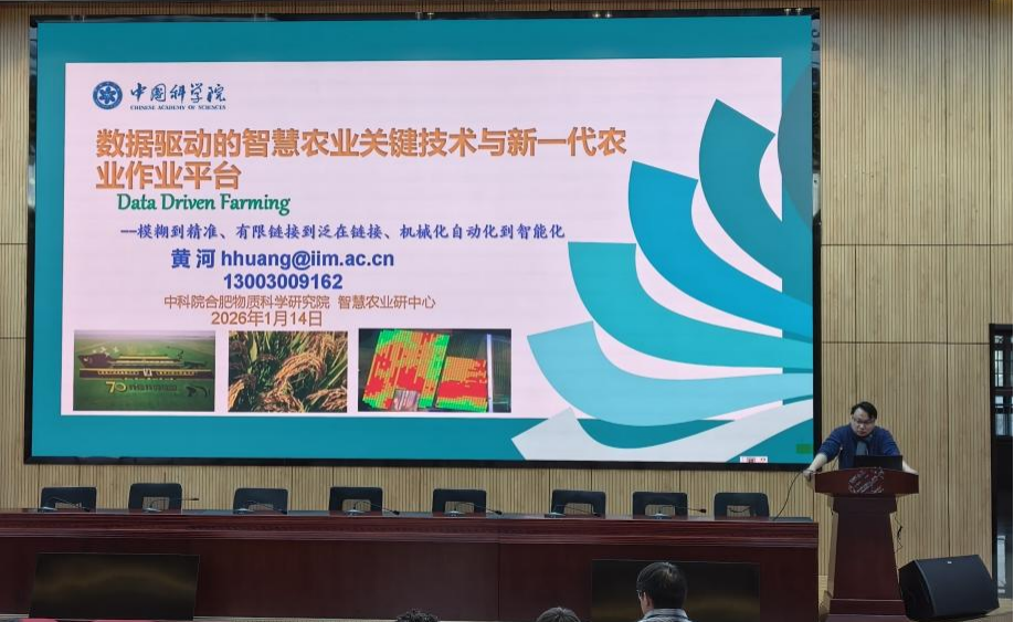 本网讯 1月14日,中国科学院合肥物质科学研究院智能所副所长,中国科学技术大学博士生导师黄河研究员应邀来学院开展学术交流,黄河研究员以“数据驱动的智慧农业关键技术与新一代农业作业平台—模糊到精准、有限链接到泛在连接、机械化自动化到智能化”为题作了专题学术报告。学院师生代表100余人到场聆听,共同探索智慧农业与环境能源学科交叉融合的创新路径。
