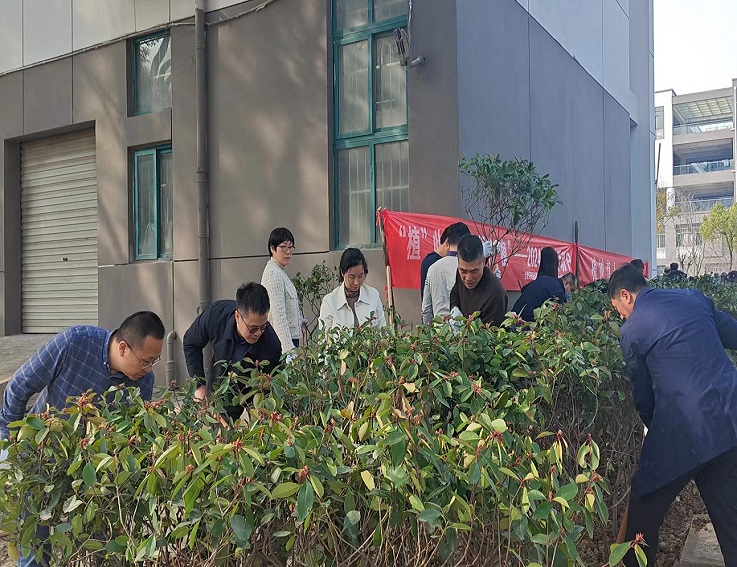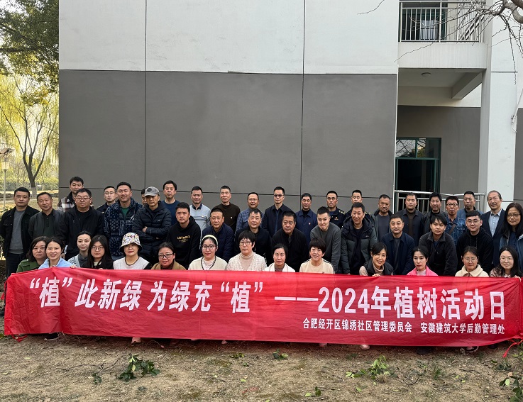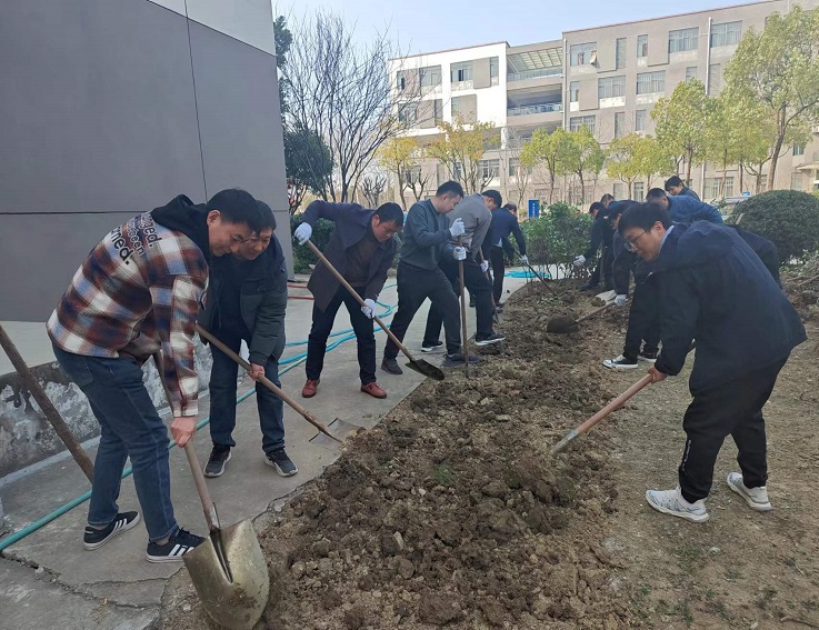 12日下午,在学校徽华楼东侧,后勤管理处各党支部与合肥经济技术开发区锦绣社区管理委员会机关党支部约50余人正在开展“‘植’此新绿 为绿充‘植’”志愿植树活动,挖坑、扶苗、栽树、培土、踩实、浇水……大家忙的热火朝天,齐心协力,共同为春日的校园增添新的绿意。