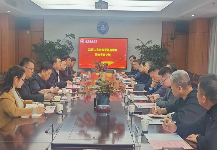 蔡国军代表学校对山东省教育基建学会张书明理事长一行的到访表示热烈欢迎,并简要介绍了学校基建基本情况。后勤基建处负责人就学校新建建筑设计布局、配套设施及节能管控等方面做了详细介绍。