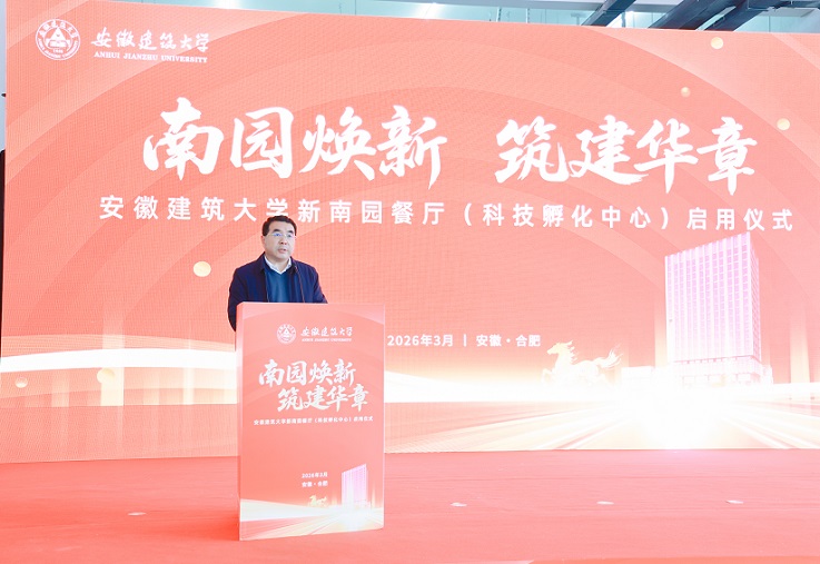 校党委书记马文革致辞。他指出,新南园餐厅(科技孵化中心)集文化餐厅、科技孵化、学生宿舍功能于一体,新增7000余个餐位、千余张床位,有效缓解了师生就餐和住宿压力。新南园的正式启用,是全校师生期盼已久的大喜事、大好事、大实事,更是学校高质量发展进程中的新里程碑,为学校“十五五”规划开好局、起好步提供了硬件支撑。他要求,新南园投入使用后,相关部门要从项目建设向运营管理、服务优化转变,带着责任和温度做好各项工作。他强调,新条件、新面貌、新气象,全校上下要以此次启用为契机,凝心聚力、积极向上、锐意进取,以实干担当推动学校各项事业高质量发展,为学校“十五五”开局之年各项工作落地见效奠定坚实基础。