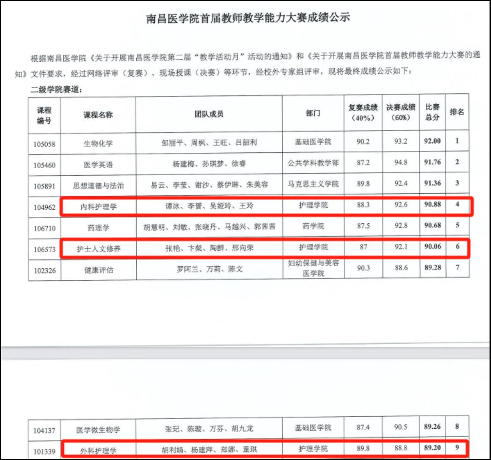 在首届教师教学能力大赛中,开元集团网站谭冰等老师的《内科护理学》课程团队、张艳等老师的《护士人文修养》课程团队、胡利娟等老师的《外科护理学》课程团队分别取得第四名、第六名和第九名的佳绩。