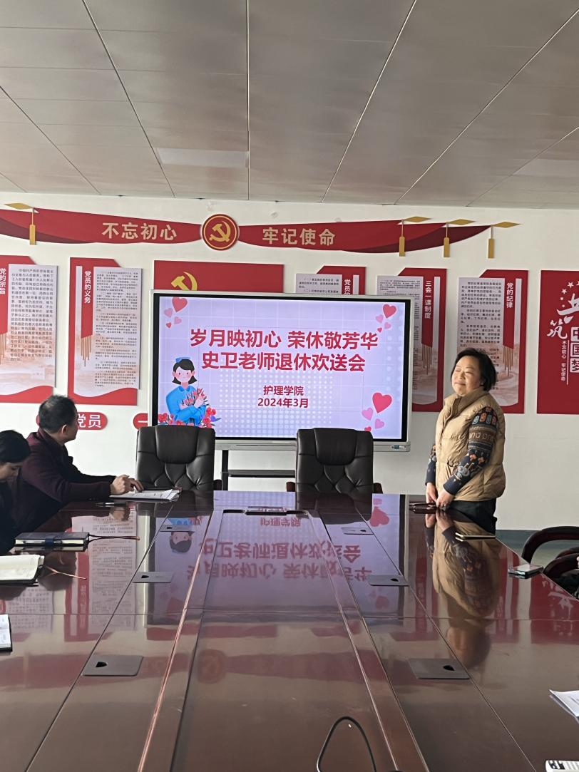 史卫老师深情回顾了在学校学院工作以来的点点滴滴,分享了自己教书育人的诸多感悟,表达了对学校的眷恋之情,言辞中饱含着对教育事业的忠诚与热爱,蕴含着对学校今后发展的期盼和祝愿,充满着对同事的感激和不舍。她表示在今后的生活中将继续关心关注学校和学院的建设与发展。