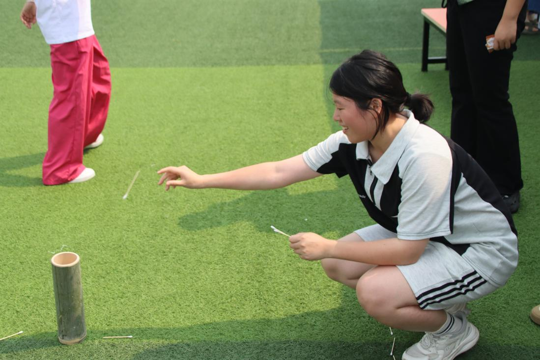 运动会设置10项特色项目,将护理专业特色与体育运动巧妙结合。在“护理接力赛”中,既考验团队协作,又让学生在奔跑中感受护理工作的严谨;“护士帽接球挑战”则独特的道具设计让学生在协作中增强职业认同感。“医疗用品投壶”则让学生用医用棉球投向壶内,以独特有趣的方式让同学们熟悉医疗用品。“健康知识问答”环节,在运动中提升专业知识储备;“穿针引线项目里,参赛者需在30秒内完成针线穿引,考验手部精细操作,与护理工作对精度的要求高度契合。传统趣味项目同样亮点十足。“袋鼠跳”中参赛者套着布袋跳跃前行,滑稽的动作引得现场笑声不断。