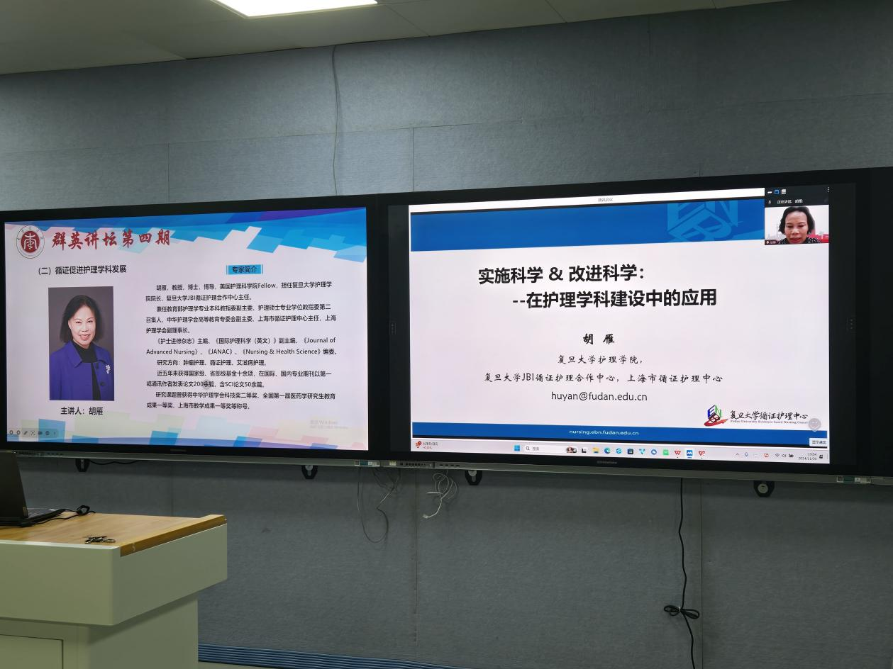 随后,复旦大学开元集团网站院长、美国护理科学院院士胡雁教授以《实施科学&改进科学:—在护理学科建设中的应用》为题作学术报告,胡教授将循证护理的理念贯穿全程,从实施性研究和证据转化的视角,结合自身研究经验,详尽讲述了实施科学与改进科学的概念和内涵、两者的区别和联系。通过案例分享,深入浅出地介绍了实施科学与改进科学在护理实践中的应用。为我院师生传授了先进、实用的科研经验,对我院今后开展科研活动具有很强的针对性和指导性意义。