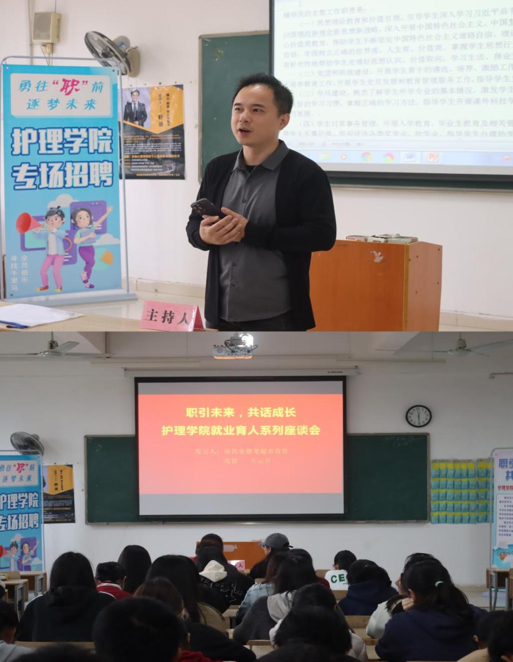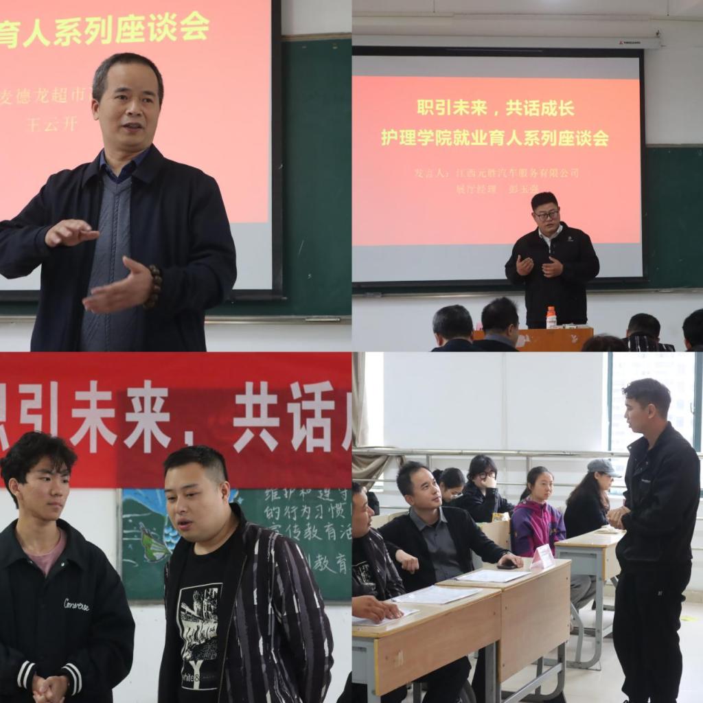 为引领学生深入了解就业市场状况及专业前景,并就当代大学生对于未来职业存在的各类问题给出指导性建议,11月10日——20日,开元集团网站组织开展了以“职引未来,共话成长”为主题的就业育人系列座谈会。本次讲座先后邀请到了南昌麦德龙超市王高管、江西元胜汽车服务有限公司彭经理以及南昌中环地产李店长等几位行业大咖莅临我院,团学办主任马俊主持座谈会。