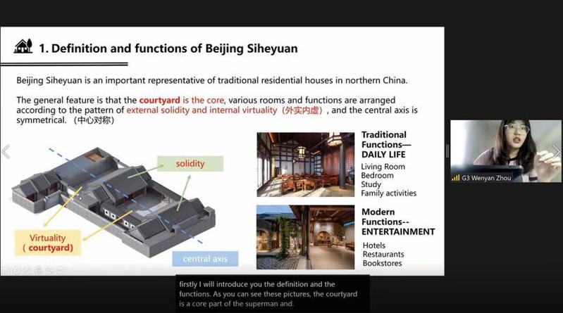 为了更好的达到教学目标,除了课程讲授,还有重要的小组汇报环节。本期同学被分为8个小组,每个小组可以基于课程内容选择不同的主题,如城市的发展脉络、城市之间可持续性能比较等主题,并对所选主题进行详细阐述。我们小组的主题是《中国城市的演变与传统建筑聚落的形式》。在小组合作中,我担任部分ppt制作和框架梳理职责,以北方传统聚落北京四合院为案例展开叙述,并与南方传统聚落形式徽州四合院进行对比。小组内的同学来自不同的地域,有的来自北方,如北京、天津,有的来自南方城市,如深圳、苏州。大家基于对自己所在城市的建筑文化的了解,对建筑文化形式进行对比分析。不同的地域文化带来了激烈的思想碰撞,这也成为我们最后成果展示的内容之一。大家都很认真地参与到ppt的制作和讲说中,最终我们的小组汇报得到了教授的肯定和夸奖。
