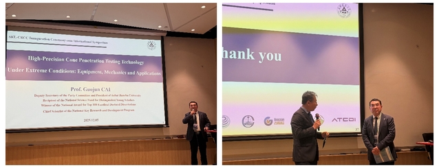 蔡国军教授应邀作大会专题主旨报告,报告题目为“Engineering Application of High-Precision Static Cone Penetration Testing Technology under Extreme Conditions”。蔡国军教授系统 阐述了极端条件下静力触探的贯入理论与技术体系,重点介绍了高精度静力触探装备的研发进展,以及复杂环境下数据智能解译方法与工程可靠度评价技术。报告围绕极端气候与灾害作用下沿海地区软弱地基勘察、基础安全评估与工程减灾等关键问题展开,展示了团队在相关领域的最新研究成果与工程实践案例。
