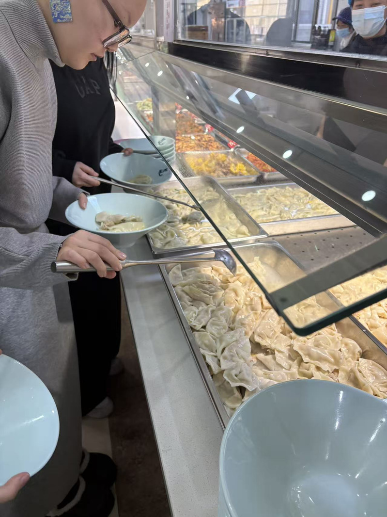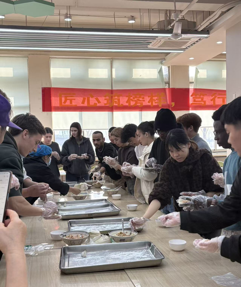 活动现场,食堂阿姨示范了“元宝饺”“柳叶饺”等传统造型的包法,留学生们在指导下认真学习。