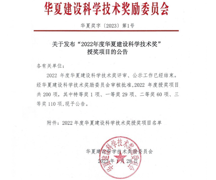 “华夏建设科学技术奖”是建设系统以社会力量办奖形式设立的建设行业科学技术奖,旨在奖励在建设行业工作中有重要贡献的组织和公民,促进科技成果向生产力转化,提升住房和城乡建设行业的综合技术水平。2022年度授奖项目共200项,其中特等奖1项、一等奖29项、二等奖60项、三等奖110项。