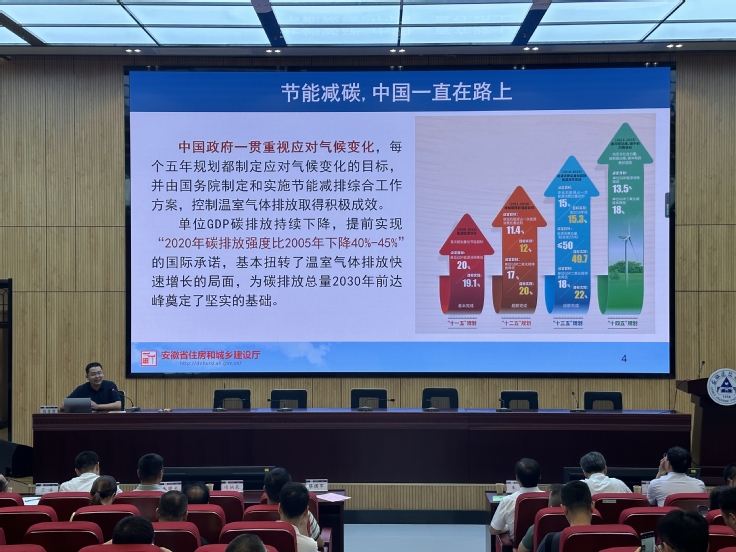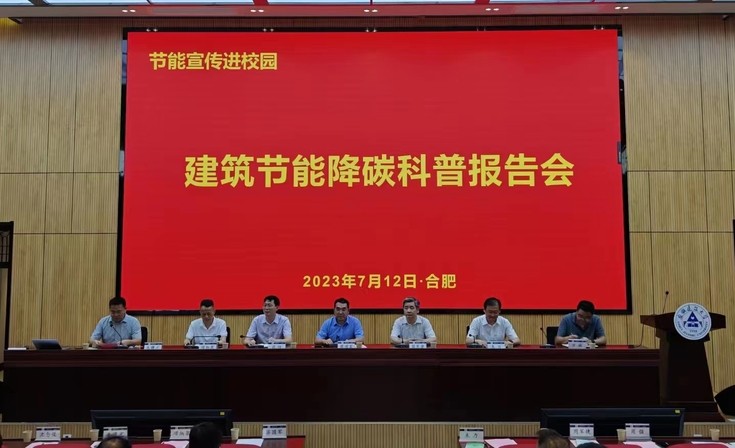 本网讯 节能宣传进校园,低碳发展讲科普。7月12日,在安徽省住房城乡建设厅指导下,beat365官网联合安徽省建筑节能与科技协会承办了建筑节能降碳科普报告会。校党委常委、副校长蔡国军出席会议。省住房城乡建设厅建筑节能与科技处副处长朱力和胡浩威、省科技厅社发处二级调研员周军捷、三级主任科员王孝文、省发改委环资处副处长周强、省机关事务管理局一级主任科员方诚、省建筑节能与科技协会会长项炳泉、副会长叶长青,以及省节能与科技协会会员代表和学校师生共150余人参加了科普报告会。