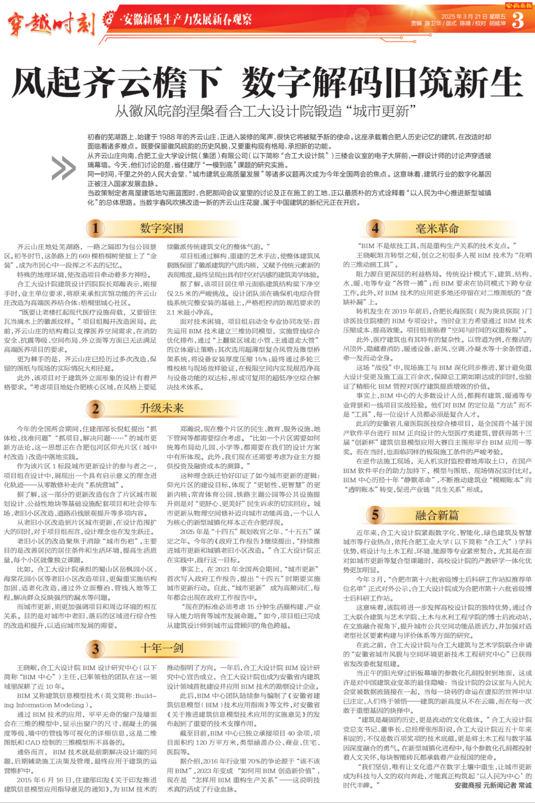 初春的芜湖路上,始建于1988年的齐云山庄,正进入装修的尾声,很快它将被赋予新的使命。这座承载着合肥人历史记忆的建筑,在改造时却面临着诸多难点。既要保留徽风皖韵的历史风貌,又要重构现有格局,承担新的功能。从齐云山庄向南,合肥工业大学设计院(集团)有限公司(以下简称“合工大设计院”)三楼会议室的电子大屏前,一群设计师的讨论声穿透玻璃幕墙。今天,他们讨论的是,省住建厅“一模到底”课题的研究实施。同一时间,千里之外的人民大会堂,“城市建筑业高质量发展”等诸多议题再次成为今年全国两会的焦点。这意味着,建筑行业的数字化基因正被注入国家发展血脉。当政策制定者高屋建瓴地勾画蓝图时,合肥那间会议室里的讨论及正在施工的工地,正以最质朴的方式诠释着“以人民为中心推进新型城镇化”的总体思路。当数字春风吹拂改造一新的齐云山庄花窗,属于中国建筑的新纪元正在开启。