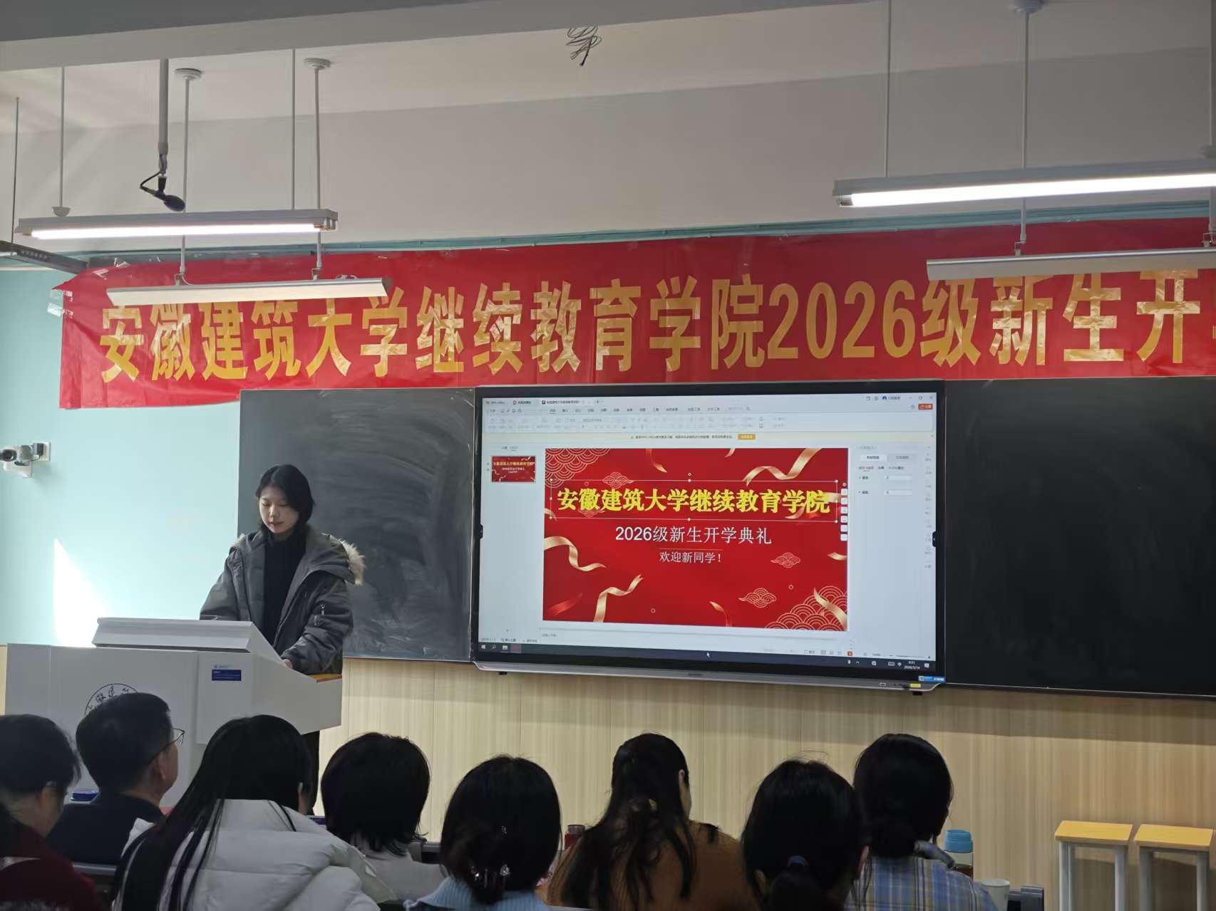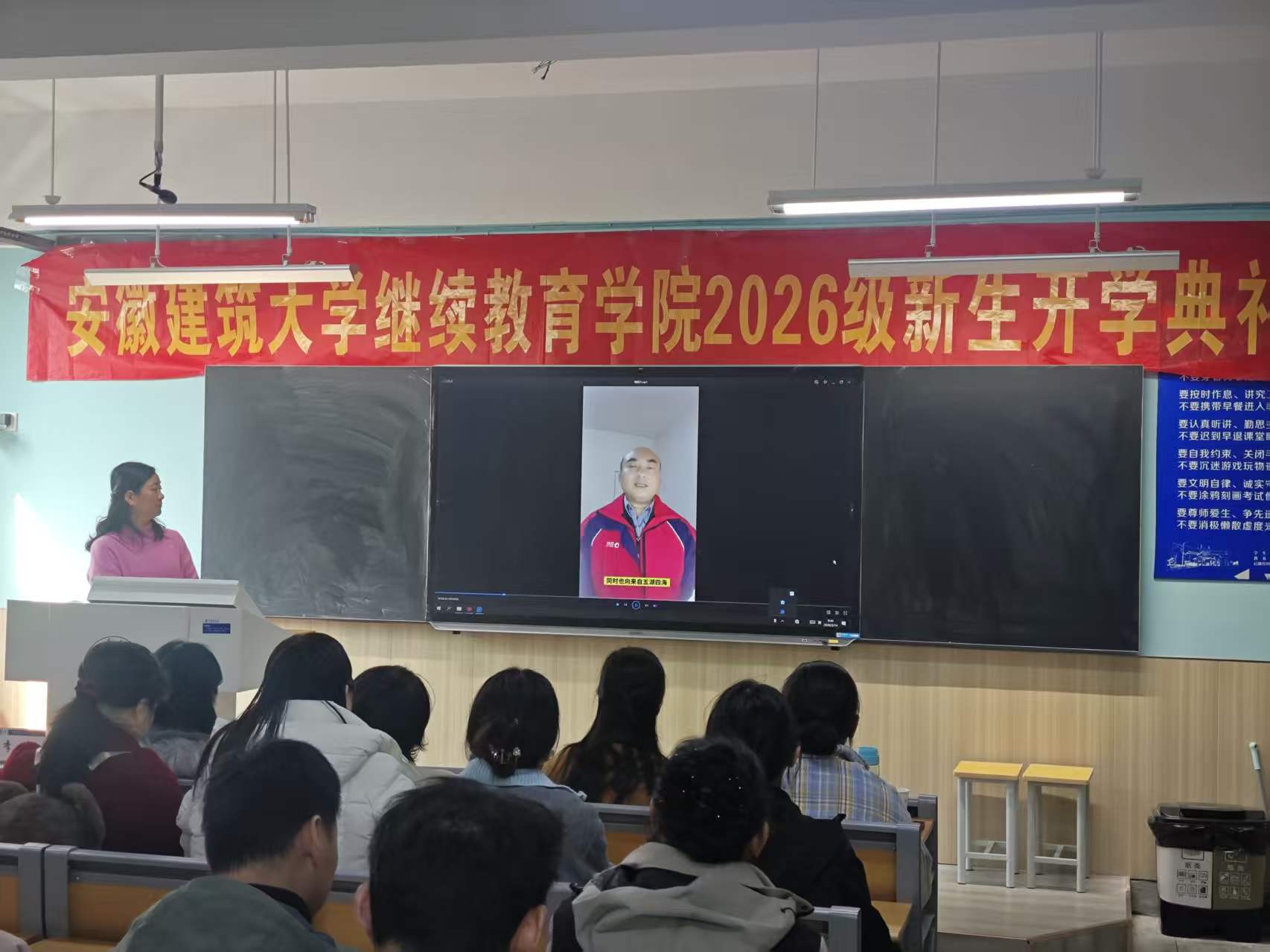 本网讯 春回大地,万象更新,在这充满希望与奋进的美好时节,继续教育学院2026级新生开学典礼于3月14日上午在金寨路校区F楼515智慧教室隆重举行。本次典礼采用“线下主会场+线上直播”的形式开展,组织部分新生线下参会,校本部及各教学点全体2026级新生同步通过线上直播参与典礼。继续教育学院院长李伟,学籍办、教学办、学工办等部门负责人,2026级年级委员会干部出席线下主会场,与全体新生共同见证这一重要时刻。值得一提的是,典礼现场暖意融融,不少学生特意带着孩子一同前来,让孩子近距离感受大学的庄重氛围与学术气息。孩子们安静聆听、认真参与,在耳濡目染中增长见识、开阔视野,提前种下向往知识、追求进步的种子。这一场特别的“亲子开学礼”,既展现了继续教育学子兼顾家庭与学业的奋进姿态,也让庄重的开学典礼更添温情与力量,成为校园里一道温暖动人的风景。