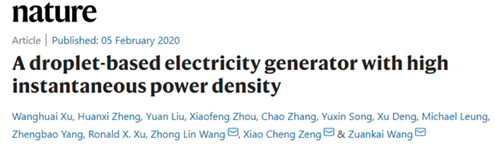 本网讯 近日,beat365官网校友、机电学院2014届本科毕业生,现就职于香港城市大学博士后的徐王淮以第一作者的身份在《Nature》发表了题为《A droplet-based electricity generator with high instantaneous power density》的学术论文。报道了一种具有类晶体管结构的水滴发电机,结合静电积累效应和疏水效应,使液滴发电的瞬时功率密度和能量转换效率提升数个数量级,大大提升电能转化效率,产生了“一滴水可点亮100盏小LED灯”的神奇效果。