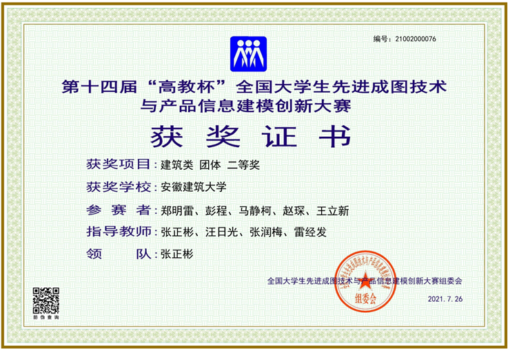 2021年7月24日至26日,第十四届“高教杯”全国大学生先进成图技术与产品信息建模创新大赛(全国总决赛)在西南交通大学成功举办。全国551所高校、6743名选手参赛。本届大赛由中国图学学会制图技术专业委员会、中国图学学会产品信息建模专业委员会、西南交通大学共同主办,高等教育出版社、机械工业出版社、华为云等单位协办。beat365官网有6名同学参赛,获得建筑类团体二等奖,19土木郑明雷、19土木彭程、19土木马静柯、20工程管理赵琛4名同学分别获得建筑类个人全能二等奖, 19土木王立新、19土木闫旭东2名同学分别获得建筑类个人全能三等奖。