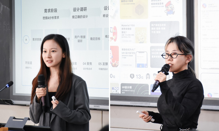 科大讯飞股份有限公司资深体验设计师,2012级工业设计专业优秀毕业生周璇、科大讯飞股份有限公司体验设计专家张薇,共同带来了题为“AIGC如何赋能体验设计”的讲座。她们深入解读了交互体验设计师的职责要求、工作流程和能力模型,通过实际案例介绍了AIGC工具参与设计策略的全流程。