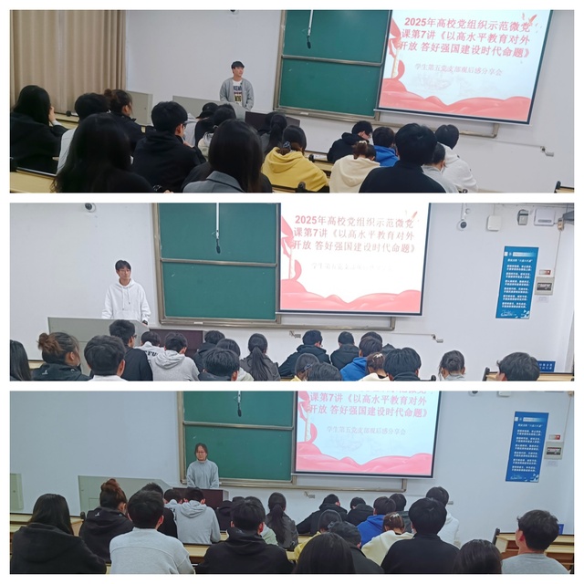本次微党课由复旦大学、厦门大学、西北农林科技大学、华南理工大学四校联合讲授,聚焦“提升国际影响力”主题,系统介绍了我国高校在引进教育资源、推动理念传播、深化科研合作及参与全球治理等方面的实践与成果,展现了中国教育的国际角色与担当。学习过程中,支部党员专注聆听、积极思考,对教育对外开放的战略内涵与实践路径有了更深入地理解。