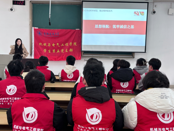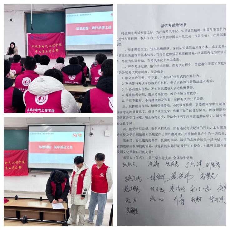 本网讯 1月6日,机电学院学生第五党支部举办“诚信立身·党员先行”主题教育暨承诺活动。活动聚焦期末考试重要节点,着力强化学生党员的诚信意识与纪律观念,通过党员示范引领,积极营造风清气正、严谨求实的校园考试氛围。