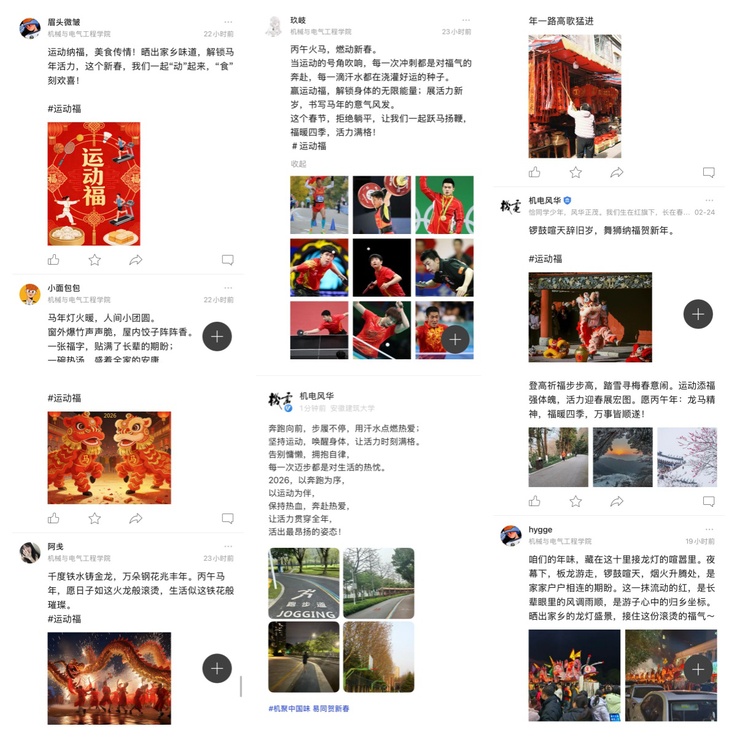 活动期间,同学们踊跃登录“今日校园”APP,在“机聚中国味,易同贺新春”话题区发布作品。大家用一幅幅画面、一段段讲述,交织成温暖明亮的新春图景,生动诠释了建大学子对生活的热爱、对文化的认同。