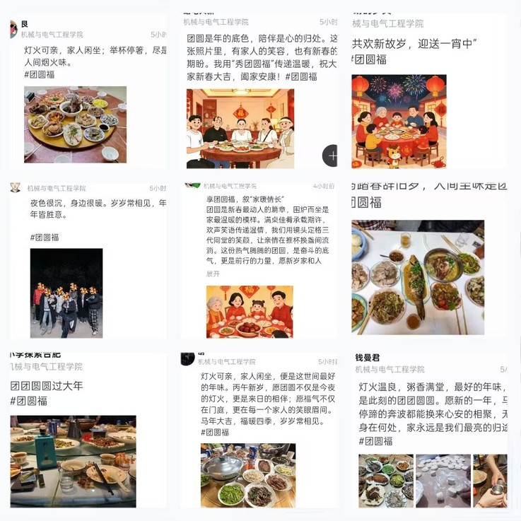 新春纳福,安康为基。同学们纷纷晒出寓意吉祥、搭配科学的“健康版”年夜饭,以及富有地域风情的养生年菜。一道道精心烹制的佳肴,一张张定格团圆的照片,一段段记录温情的短视频,既呈现了舌尖上的年味,也记录下围炉夜话、笑语盈盈的团圆时光,映照出机电学子热爱生活、崇尚健康的积极风貌。