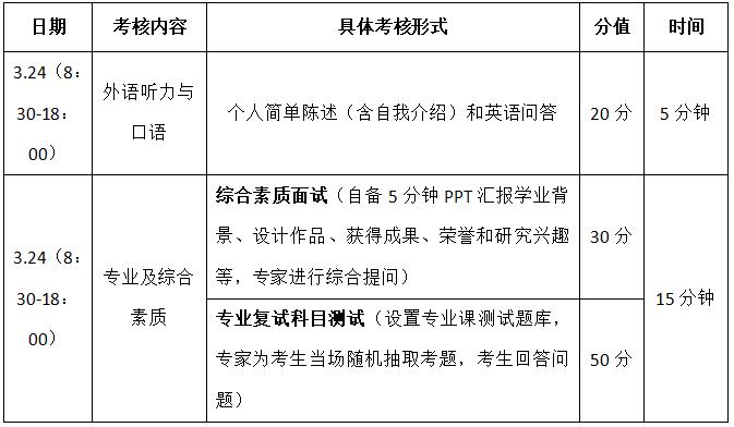 考生准备5分钟以内PPT汇报文件(不超过10页),综合呈现个人学业背景、设计作品、成果荣誉和研究兴趣等,待复试时以共享屏幕形式进行线上陈述,专家对材料进行综合考查。