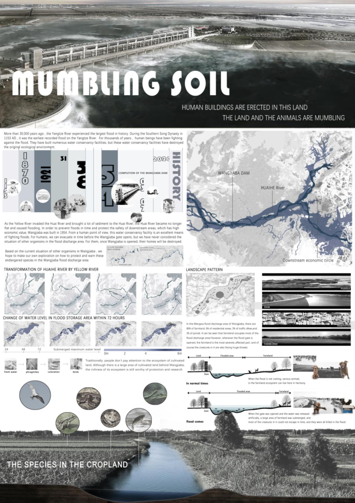 基于这种情况,我们希望都能对王家坝这些雨季就可能流离失所的生物的安全性做出自己的探索。过去,人们很少注意灾区生物的安全。我们设想有一种装置可以放大洪水发出的次声波,这样动物就可以在洪水释放前得到预警并争取到宝贵的缓冲时间。鉴于新面临的问题,设计提出了一系列建议和方案,从而来改善人与土地的关系。我们积极探索、轻触自然、呵护生命,“呢喃的土地”愈发美好。