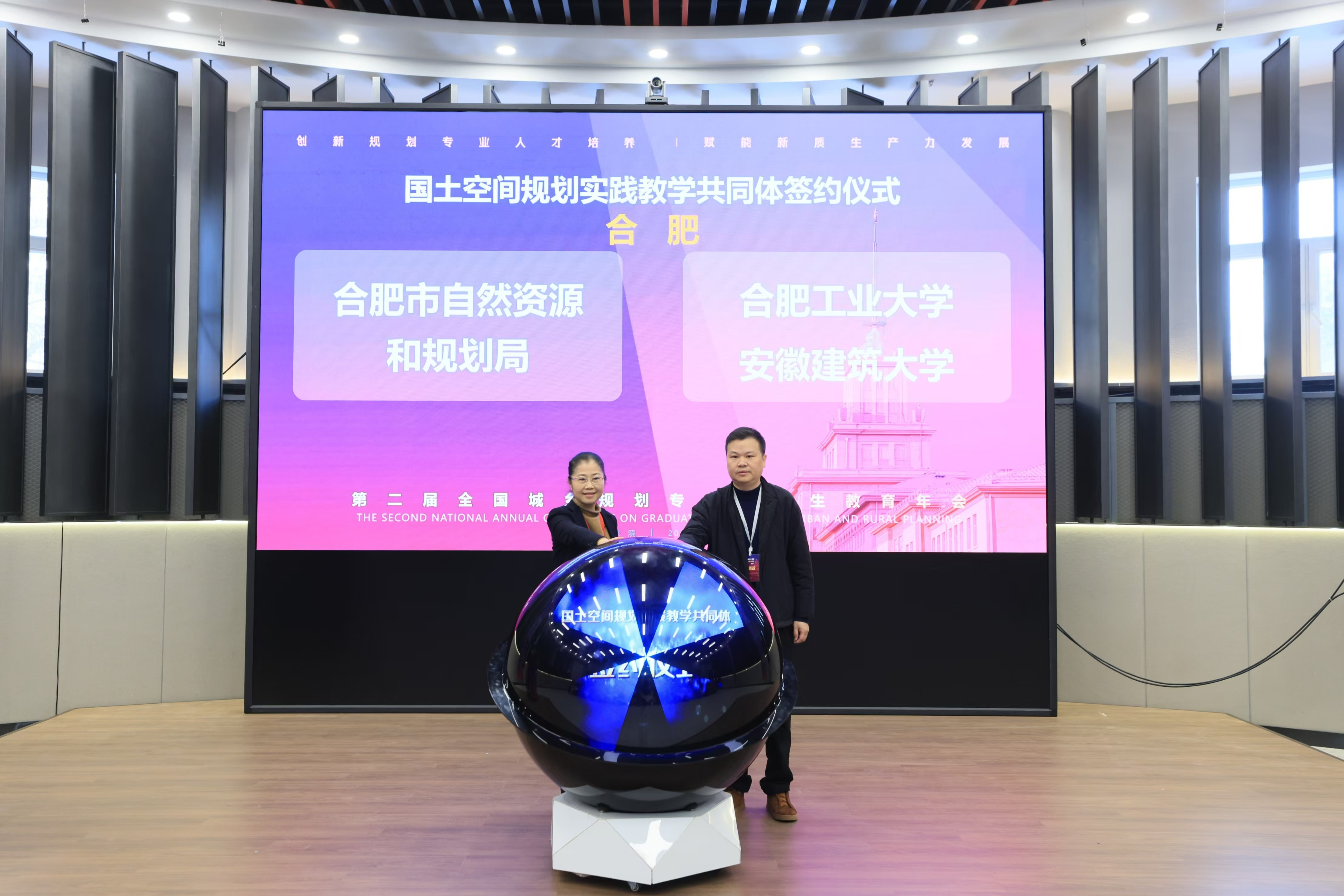 本次年会特别推出“国土空间规划实践教学共同体”签约仪式,会上32个国土空间总体规划国务院审批城市与在地高校代表共同签约。会议前期,学校与合肥市自然资源和规划局开展了合作交流,制定了校局战略合作框架协议。在大会主会场,建规学院规划系主任汪勇政副教授与合肥市自规局副局长宋雪鸿参与“实践教育共同体”签约仪式。
