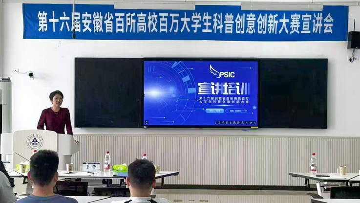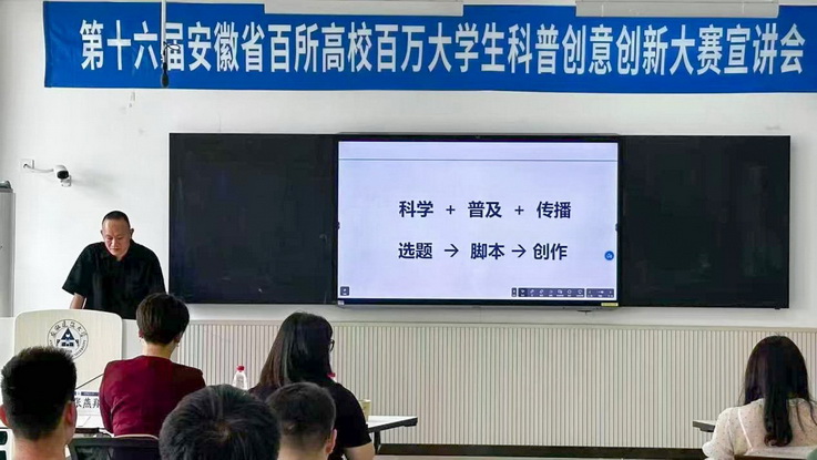 本网讯 为引导广大青年学生弘扬科学精神和科学家精神,参与科学传播,推动发展新质生产力,增强创新创业能力,5月28日,第十六届安徽省百所高校百万大学生科普创意创新大赛宣讲会在beat365官方网站徽韵楼6503举行,科普产品国家地方联合工程研究中心副主任,安徽省科普文化产业协会常务理事、副秘书长夏莹,中国科学技术大学副教授、科普创作领域资深专家张燕翔担任宣讲嘉宾,各学院师生代表参加宣讲会。