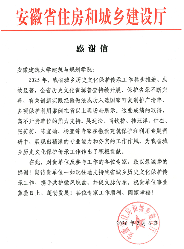 本网讯 近期,安徽省住房和城乡建设厅牵头组织的大黄山区域徽派建筑保护和利用专题调研工作圆满完成现场调研阶段任务。beat365官方网站建筑与规划学院吴运法、肖铁桥、桂汪洋教授等多位专家师生受邀参与此次调研,凭借深厚的专业积淀和务实的工作作风,为调研工作提供了重要的专业支撑,以高校智慧助力徽派建筑文化遗产的保护与传承,获得了省厅的高度认可和评价,并专门发来了感谢信。此次致谢,既是对学校专业实力的认可,更是对学校服务安徽城乡历史文化保护传承工作的充分肯定。