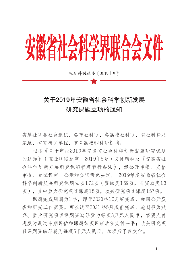 2019年安徽省社会科学创新发展研究课题攻关研究项目