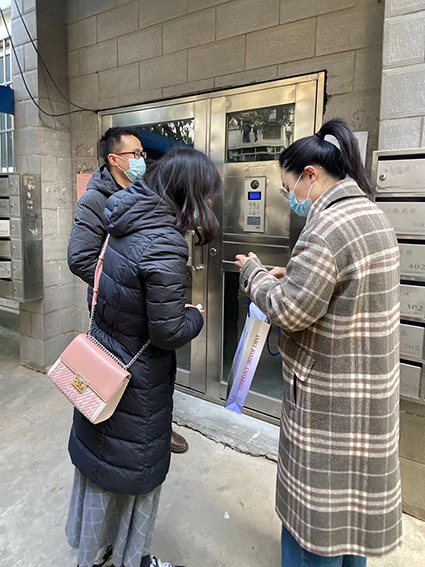 20日下午,支部8位包保联络员对北区13、14栋家属楼住户逐户进行走访,了解其居住情况、传达了学校疫情防控工作的新要求,并公布了联络员联系方式。为便于住户及时了解掌握全国中高风险疫情地区信息,减少接触和感染风险,做好自身防护,联络员向大家介绍了通过国务院客户端查看国家发布的疫区信息的方法。