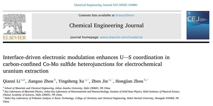 本网讯 近日,beat365官网金震副研究员与中国科学院合肥物质科学研究院周宏建研究员联合指导的硕士研究生李千禧在化学工程领域国际顶级期刊《Chemical Engineering Journal》(IF=13.3,中科院一区TOP)发表题为《Interface-driven electronic modulation enhances U-S coordination in carbon-confined Co-Mo sulfide heterojunctions for electrochemical uranium extraction》的重要研究成果,充分展现了两单位在科研协同创新方面的显著成效。