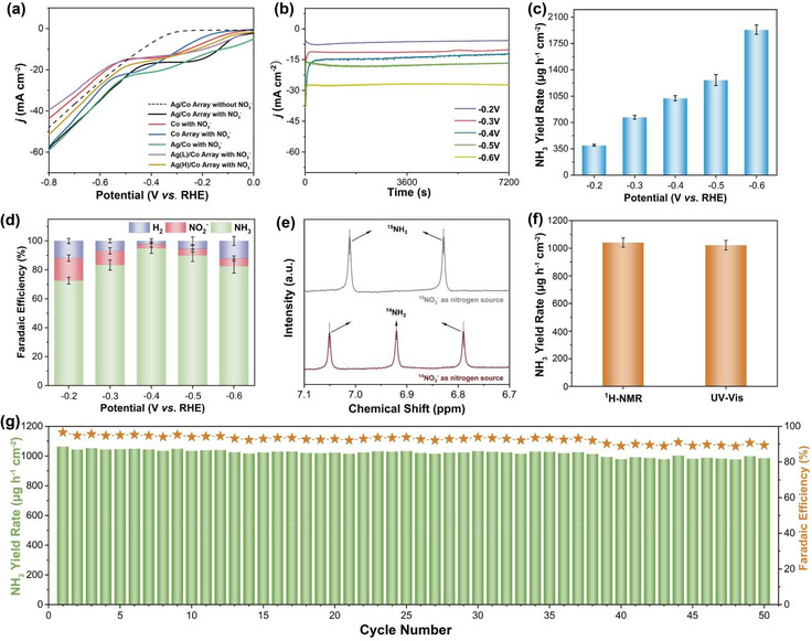 研究团队采用定点激光辐照技术,构建了空间上分离的功能催化界面:hcp-Co/fcc-Co异质结有效促进NO3-的高效脱氧,而Ag/hcp-Co界面则加速NO2-的质子化反应动力学。原位光谱分析与差分电化学质谱(DEMS)结果共同验证了*NO2中间体在不同活性位点间的穿梭机制。密度泛函理论(DFT)计算进一步表明,界面处的电荷重新分布(1.74个电子从Co向Ag转移)显著降低了决速步骤(NO→*NOH)的能垒至0.25 eV,同时有效抑制了析氢反应的发生。
