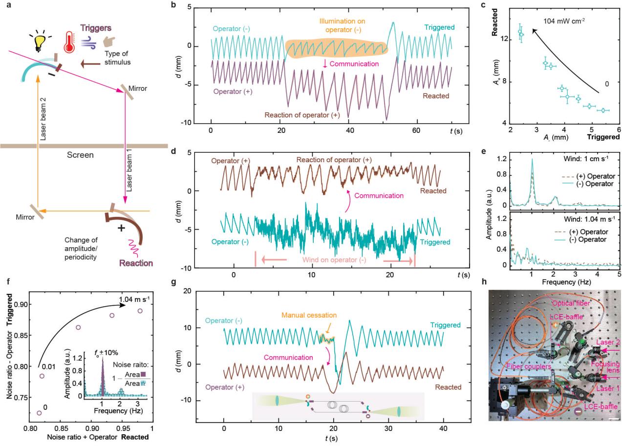 该研究提出一种基于光学反馈的高度定向交互策略,构建由遮光板与液晶弹性体软驱动器组成的光机械“算子”系统,在闭合光路中实现自振荡、类稳态调节及材料间的光信号传递。光路优化使系统能够实现远程感知,在形变状态与振荡频率上呈现自适应调控能力。该成果展示了利用光构建响应材料交互网络的通用设计方法,为下一代具有环境感知、自主反馈能力的智能材料奠定了重要基础。(作者:李凯;一审:陈东;二审:张宁;三审:王媛)