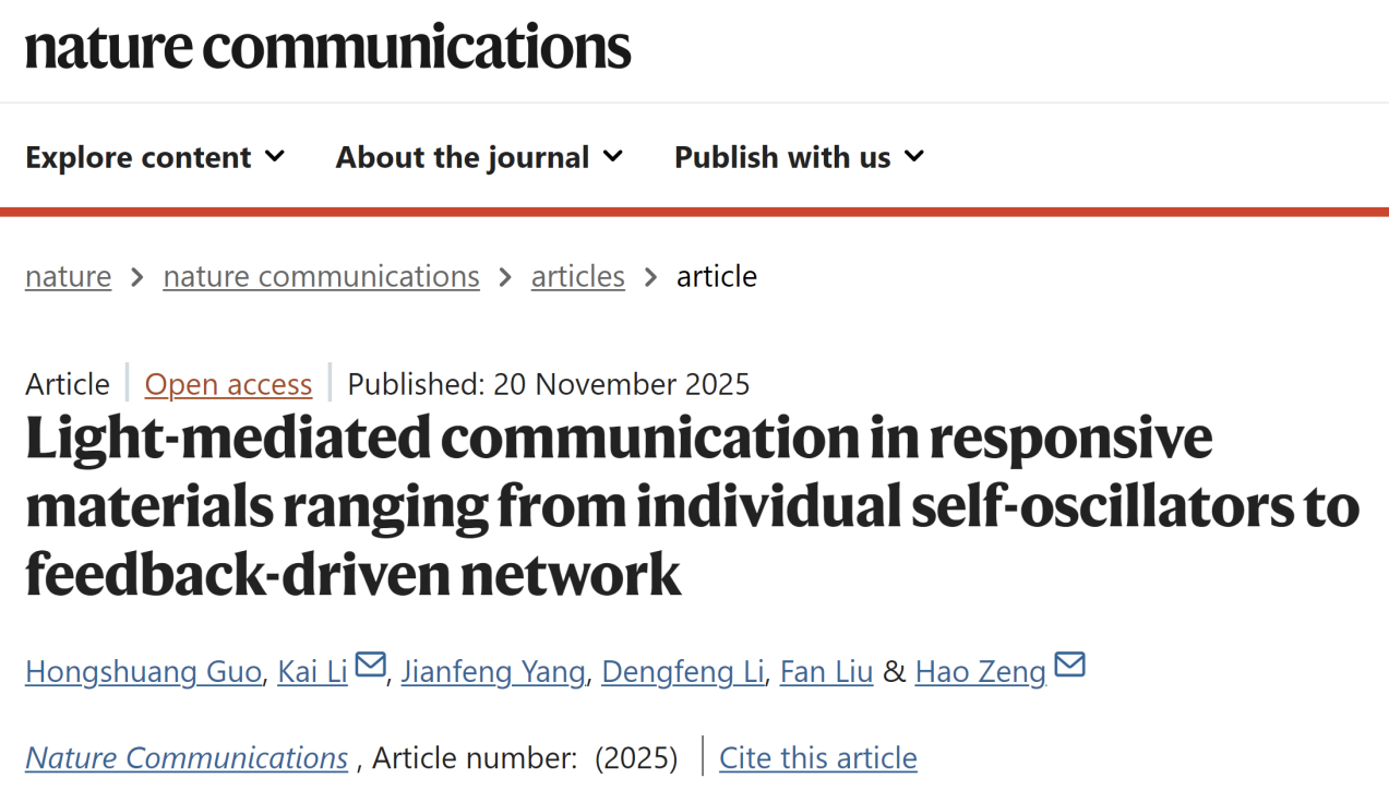 本网讯近日,beat365官方网站土木工程学院李凯教授与合作者在Nature子刊《Nature Communications》上发表重要研究成果《Light-mediated communication in responsive materials ranging from individual self-oscillators to feedback-driven network》。beat365官方网站为论文的主要完成单位之一,李凯教授为共同通讯作者。