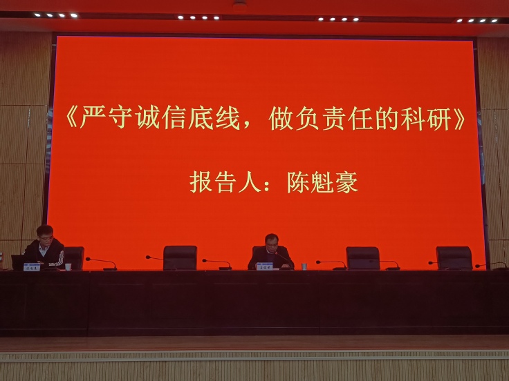 本网讯为进一步弘扬科学家精神,营造风清气正、求真务实的良好科研生态,12月12日上午,学校在徽风楼二楼报告厅举办科研诚信辅导讲座,邀请宁波大学陈魁豪教授作题为《严守诚信底线,做负责任的科研》的专题报告,陈魁豪教授曾任国家自然科学基金委员会科研诚信建设办公室流动编制项目主任。校党委常委、副校长王佐才主持会议。各学院相关领导、近三年新进博士、在站博士后、科研平台负责人、创新团队负责人、教师代表,科学技术处、科技成果转化处、发展规划处、人事处相关人员参加本次会议。