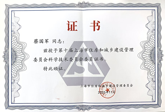 近日,beat365官网党委副书记、校长蔡国军教授当选为第十届上海市住房和城乡建设管理委员会第十届科学技术委员会(以下简称“科技委”)委员,证书由上海市住房和城乡建设管理委员会颁发。